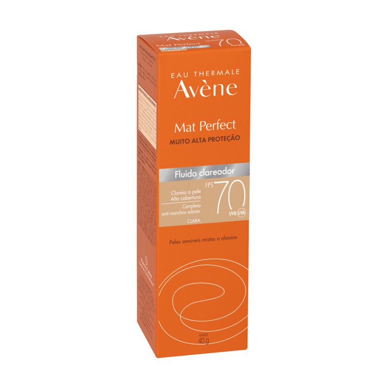 Mat Perfect Fluido clareador FPS 70 é um protetor solar com muito alta proteção contra os raios UVB, UVA e que traz um benefício da ação clareadora que ajuda a clarear, prevenir e uniformizar manchas. Sua fórmula matifica a pele por 12h².